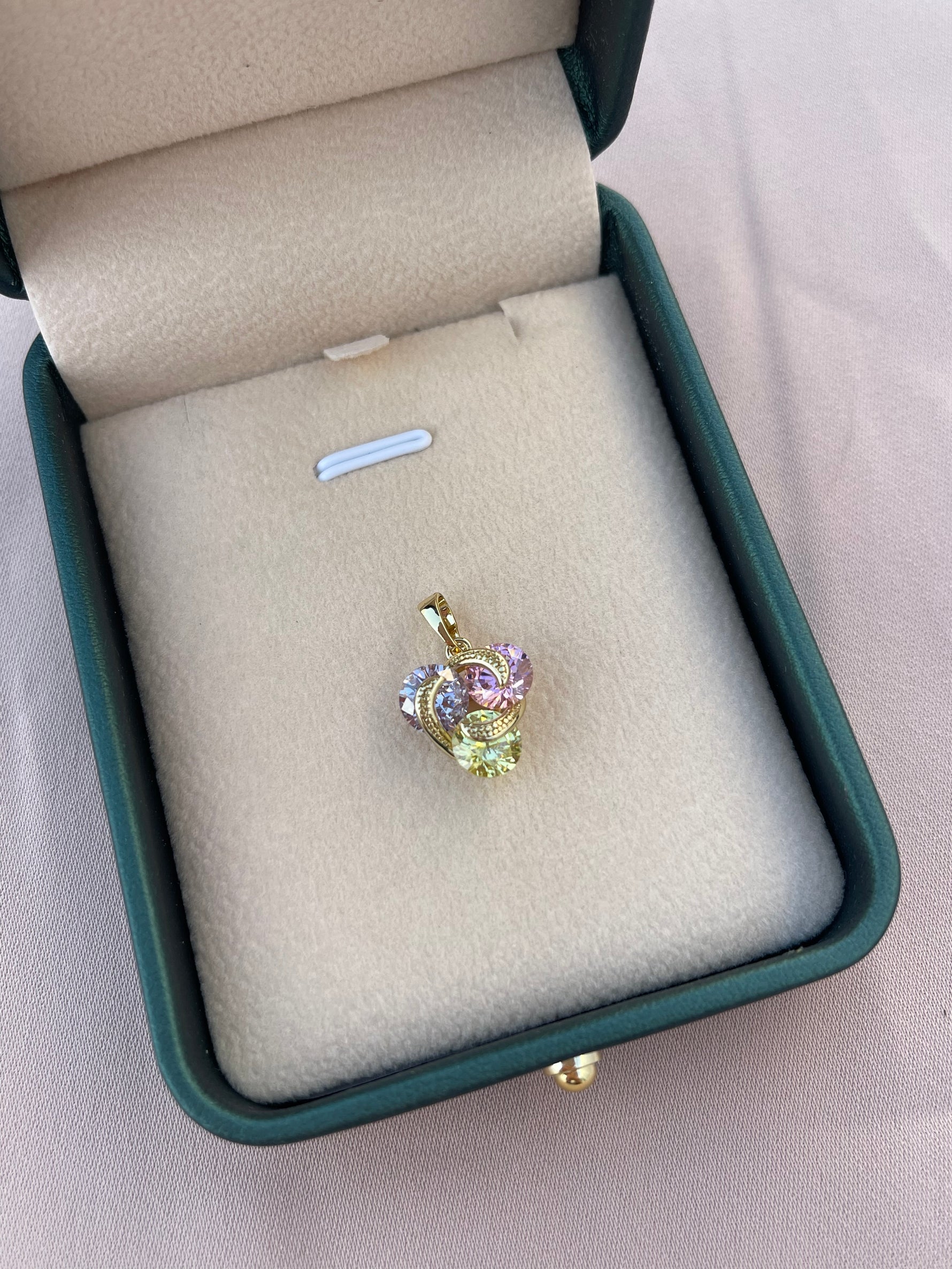 Precio unitario porDije elegante con tres diamantes disponibles en blanco o en versión multicolor, ideal para un look sofisticado y brillante. Elaborado en oro laminado 14 kilates para un acabado duradero y de calidad.