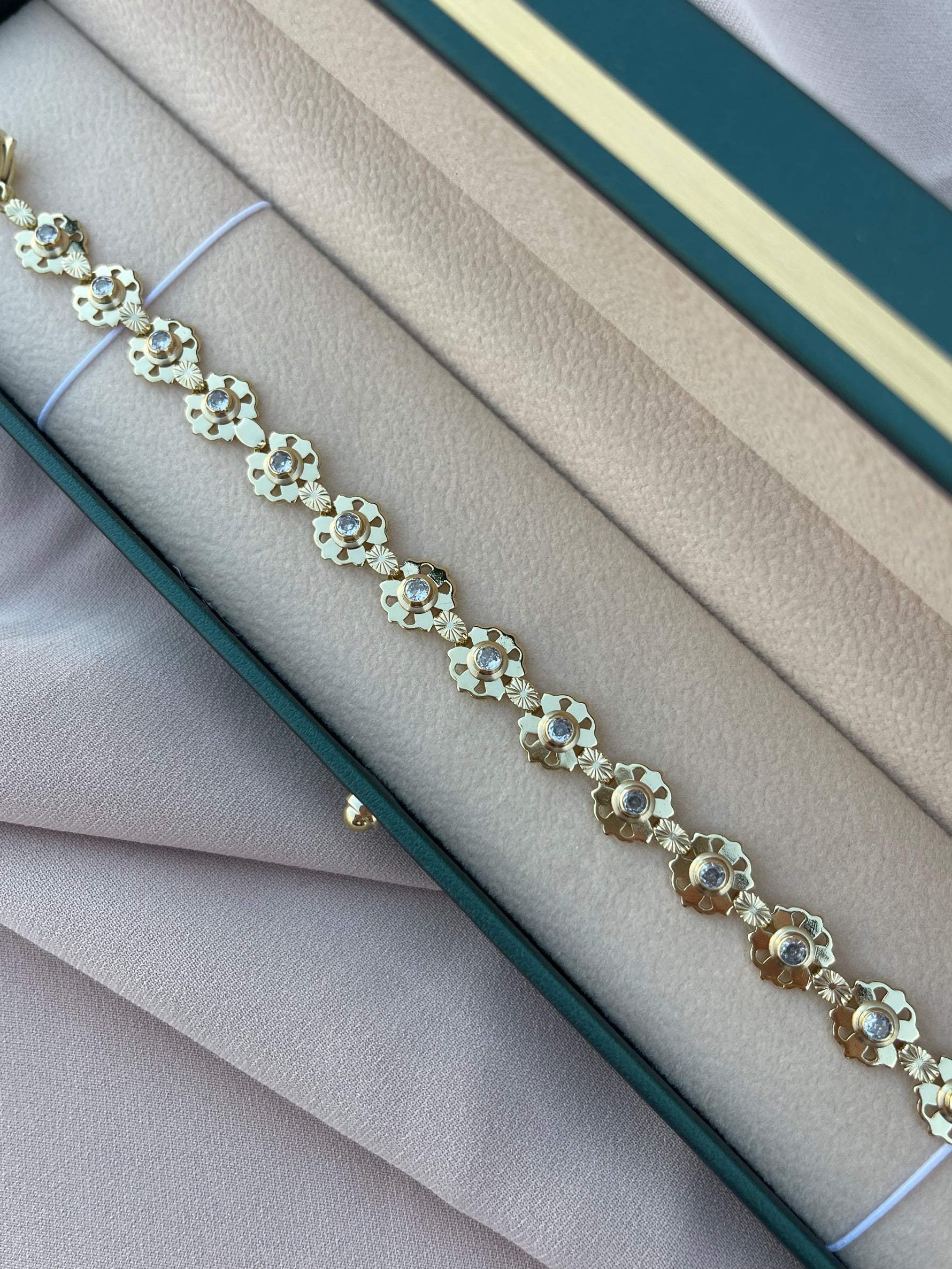 Pulsera completa con delicadas florecitas, cada una con un brillante diamante en el centro que aporta un toque de lujo y sofisticación. Elaborada en Oro Laminado 14K, combina elegancia, durabilidad y un brillo que realza cualquier look.