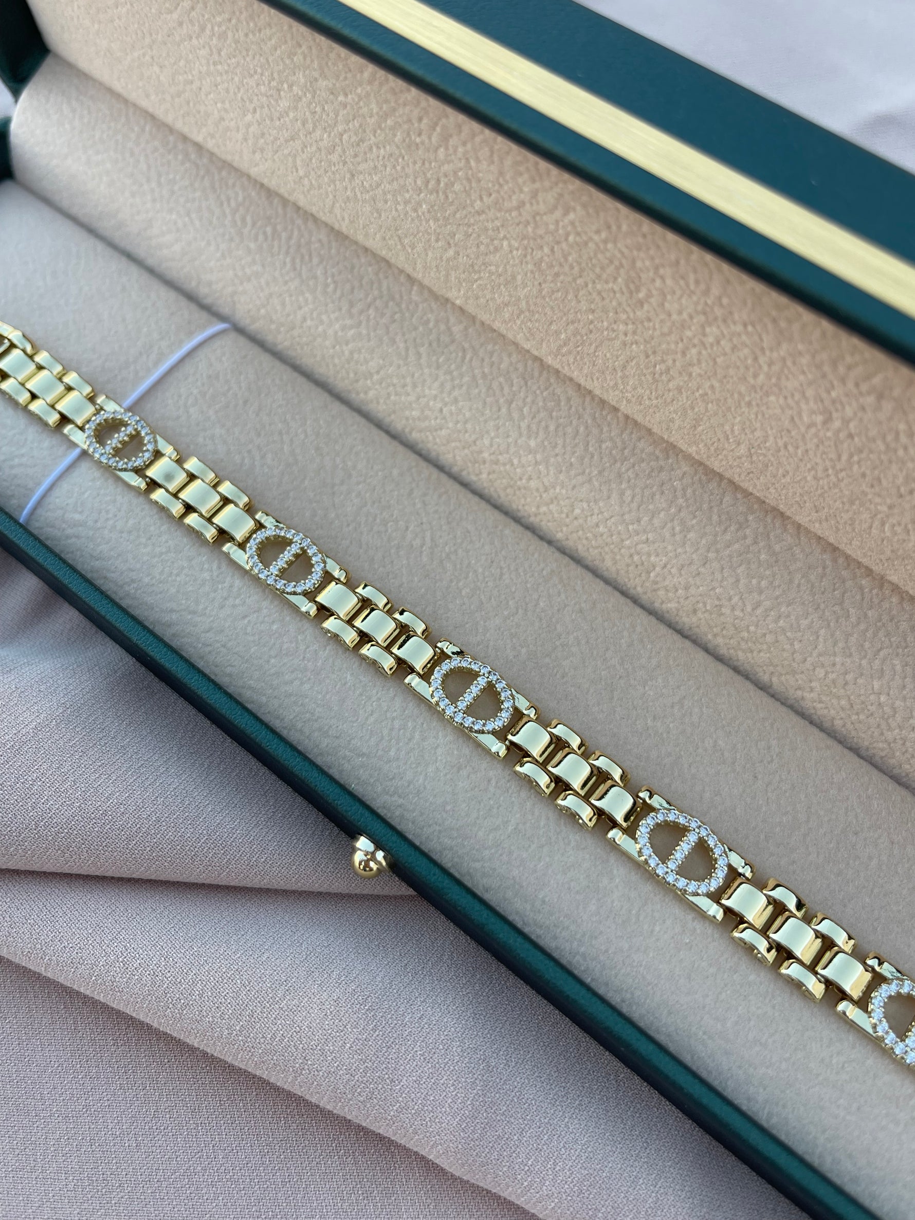 Pulsera de estilo sofisticado con correa de diseño entrelazado y el detalle de las letras CD alrededor, que aportan un toque exclusivo y elegante. Fabricada en Oro Laminado 14K, combina brillo, durabilidad y un acabado de lujo para cualquier ocasión.