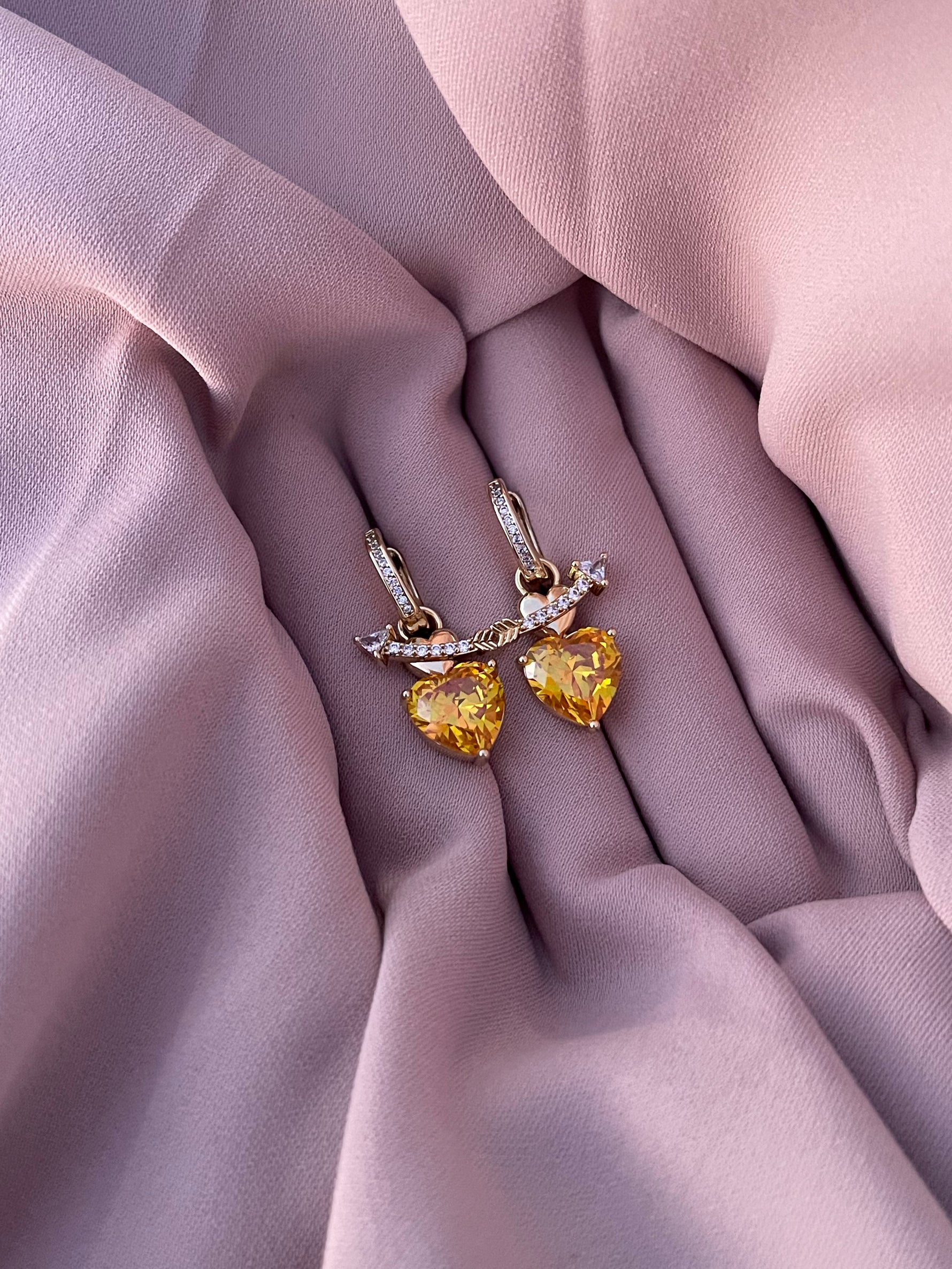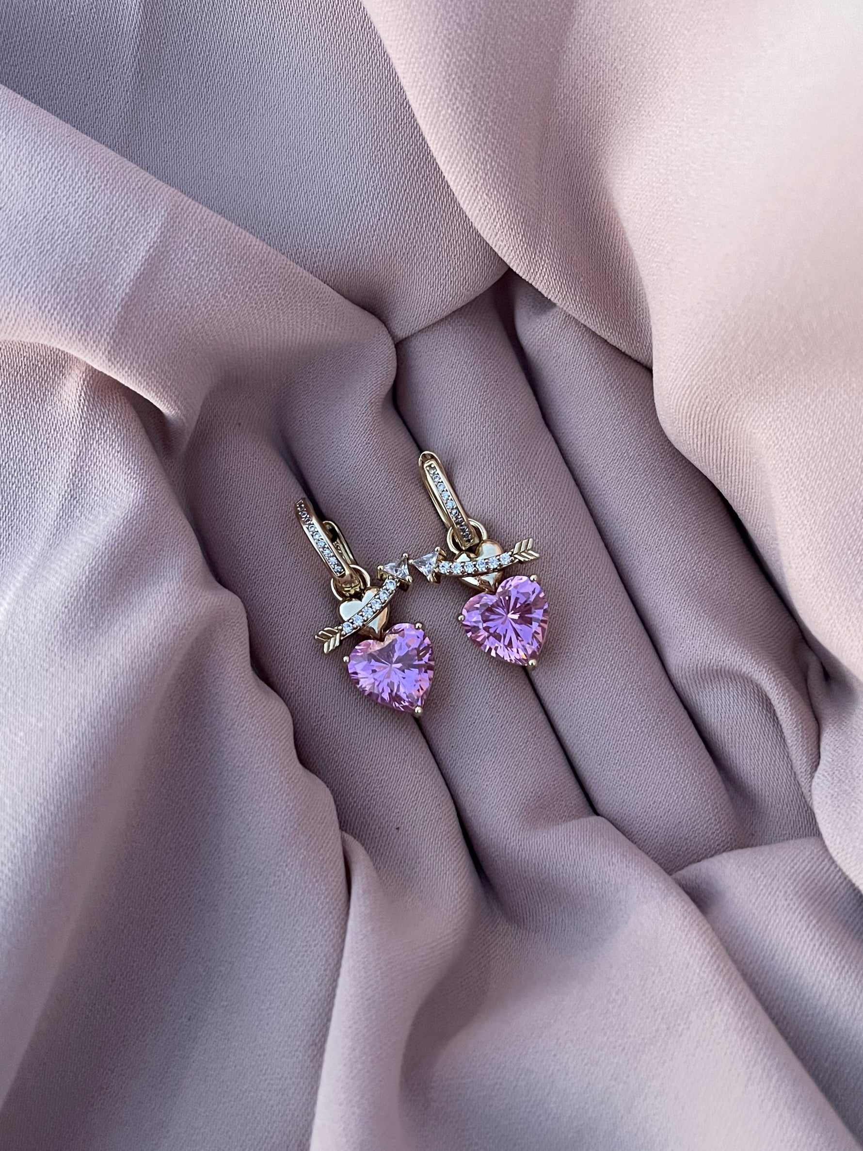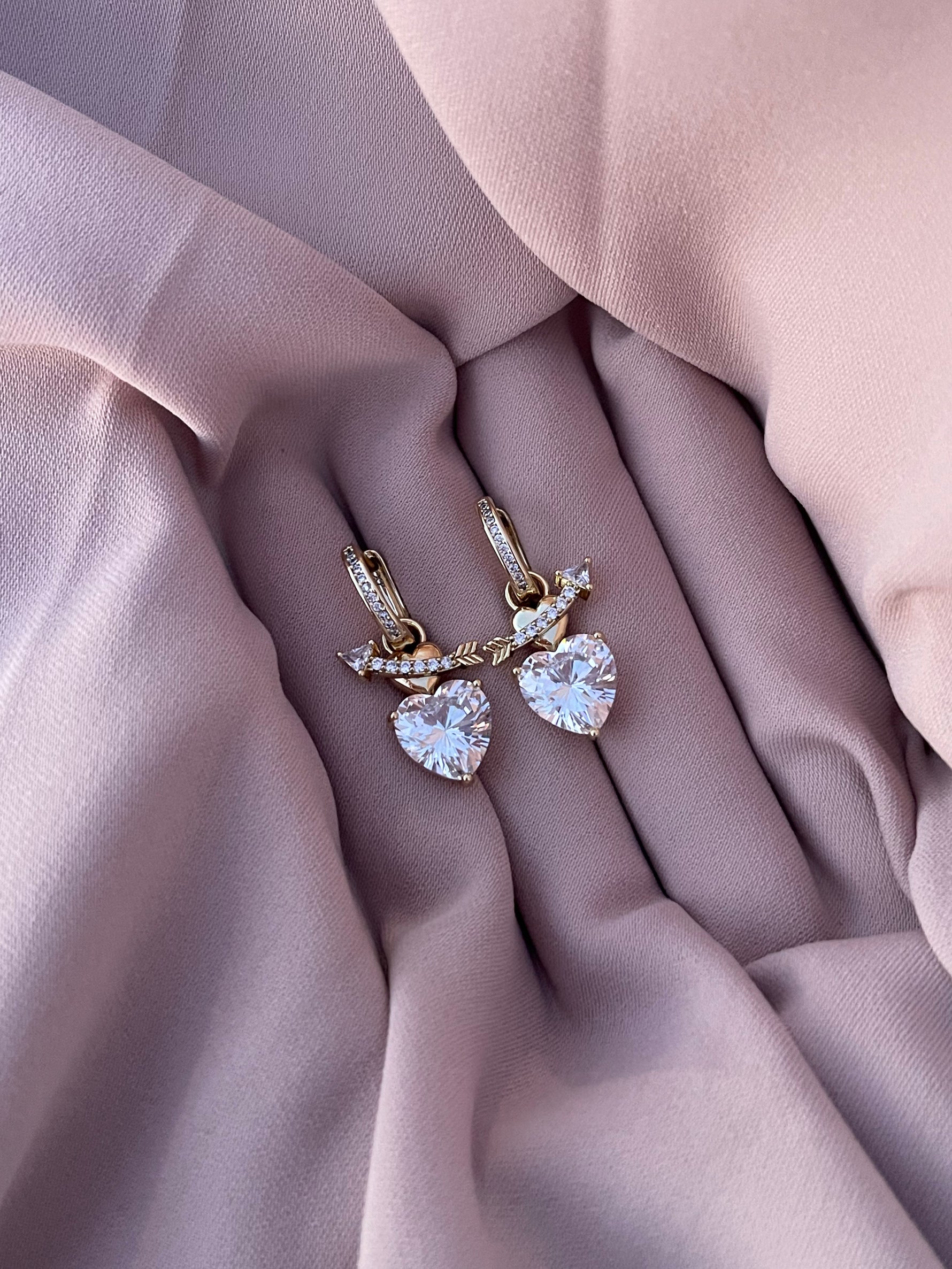 Pendientes con corazón principal y un corazón pequeño con flecha, elaborados en oro laminado 14k, perfectos para un detalle romántico y elegante.