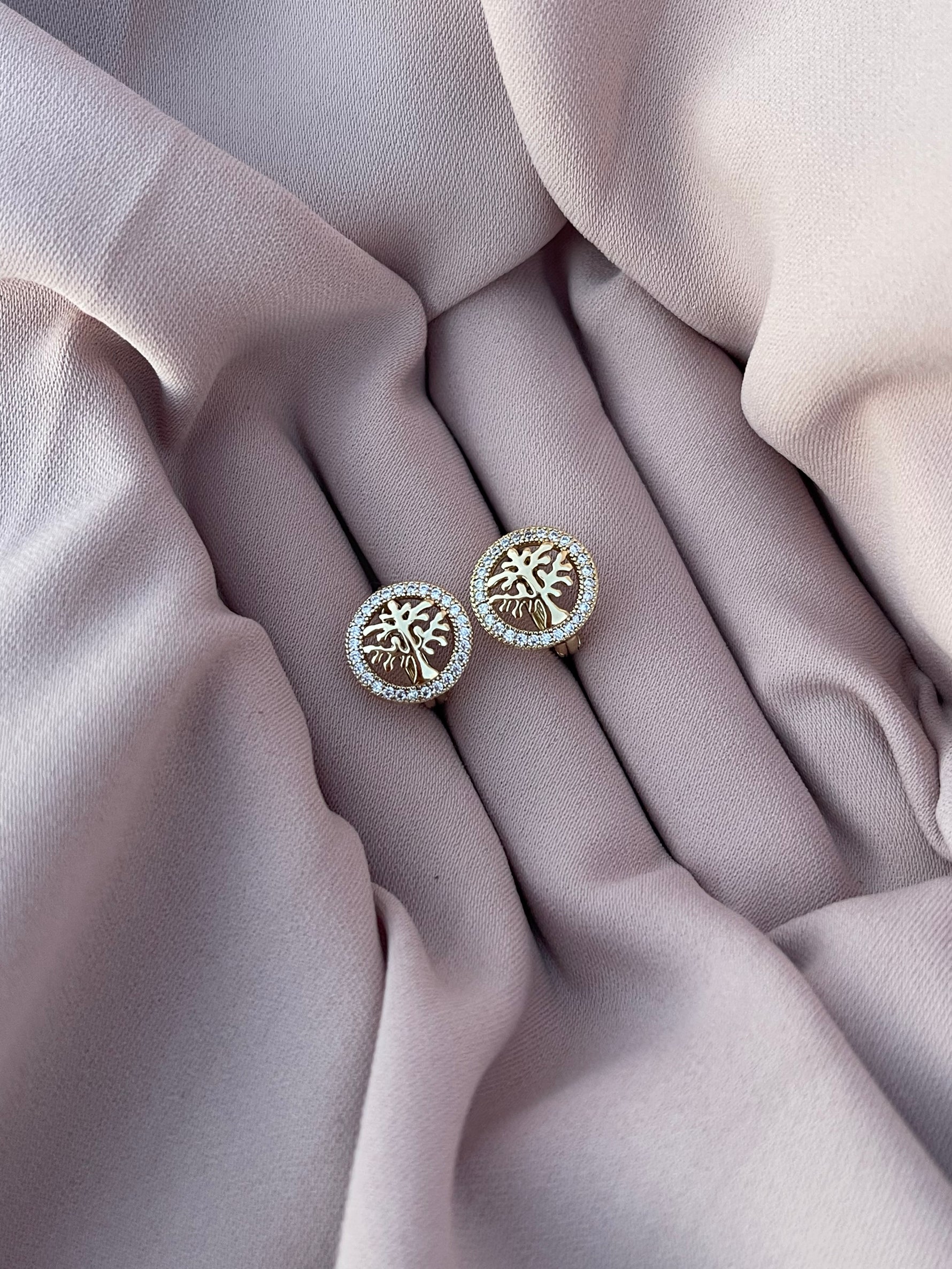 Pendientes con diseño del árbol de la vida en oro laminado 14k, símbolo de fuerza, crecimiento y armonía, ideales para llevar siempre contigo.